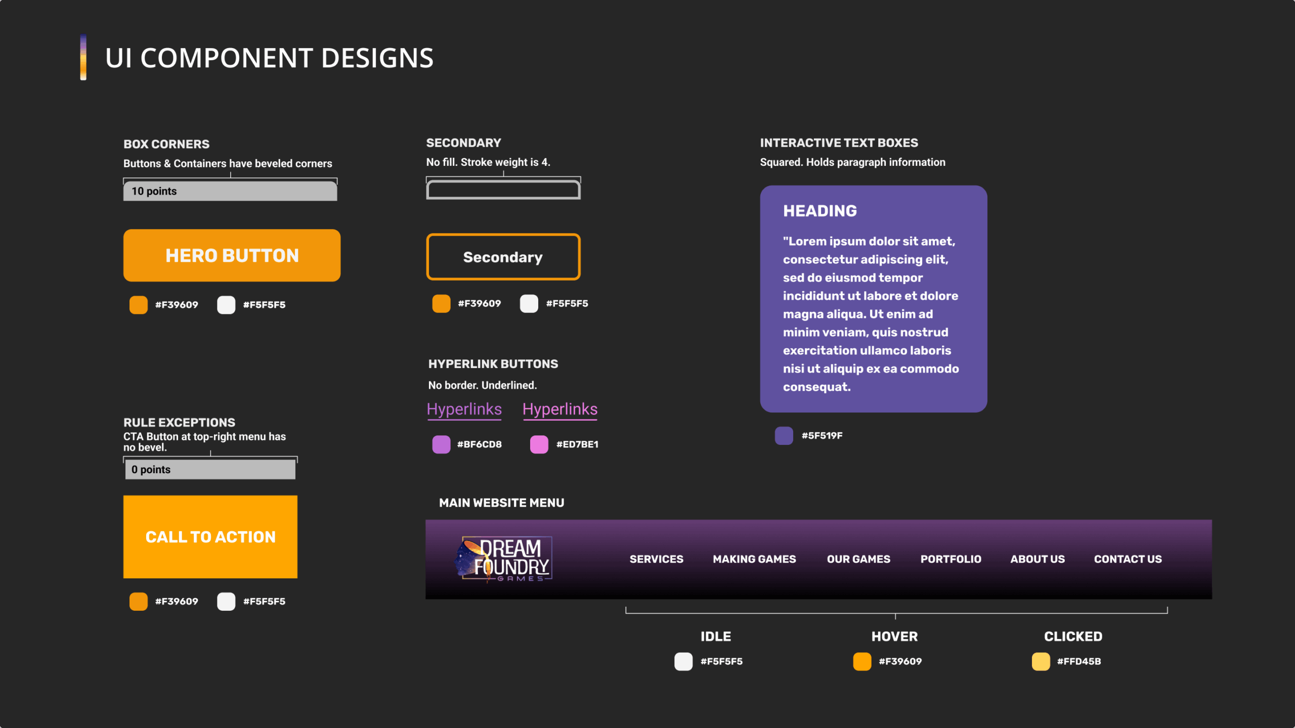 This project taught me the value of creating a visual style and language based on pre-existing branding; retaining the colors and feeling of a logo & brand, while using new fonts and designs that fit the aesthetic of Dream Foundry Games. In future projects, I would like to have the opportunity to work more with icons, and explore more in terms of the mobile-first approach to design.