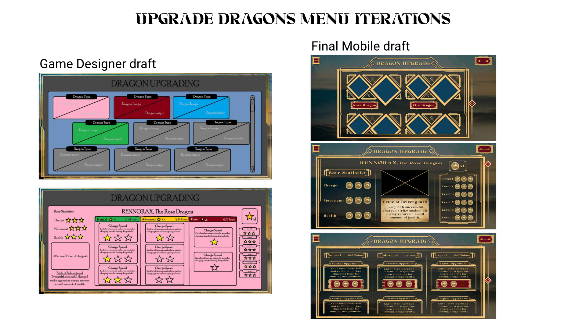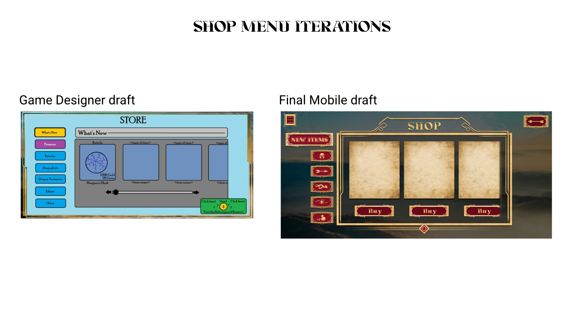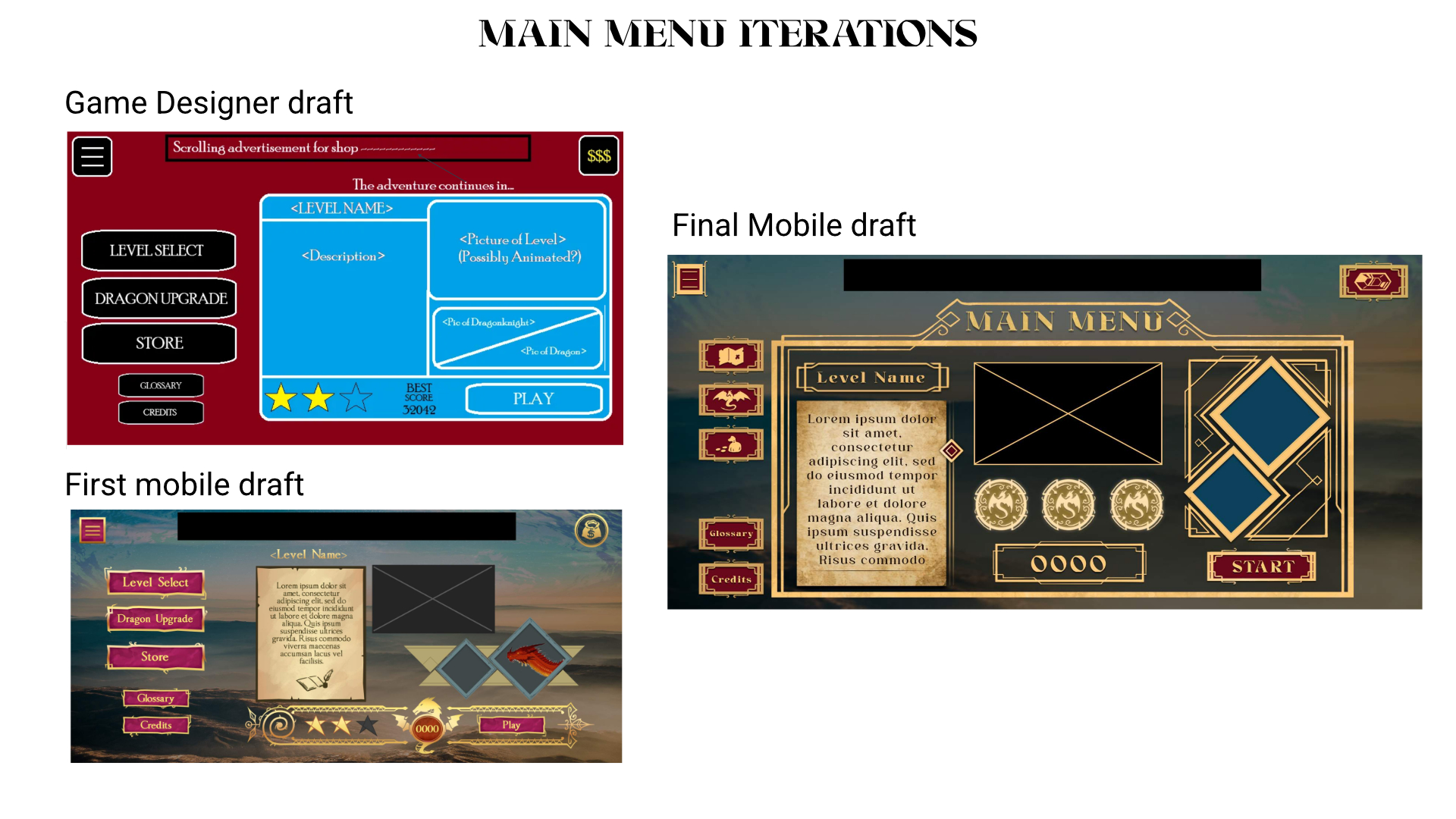The initial mock-ups and layout were created by our game designer, Cameron Bowman. These were created as a mobile app layout at first, then reworked for platform gaming in mind.